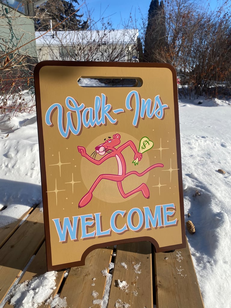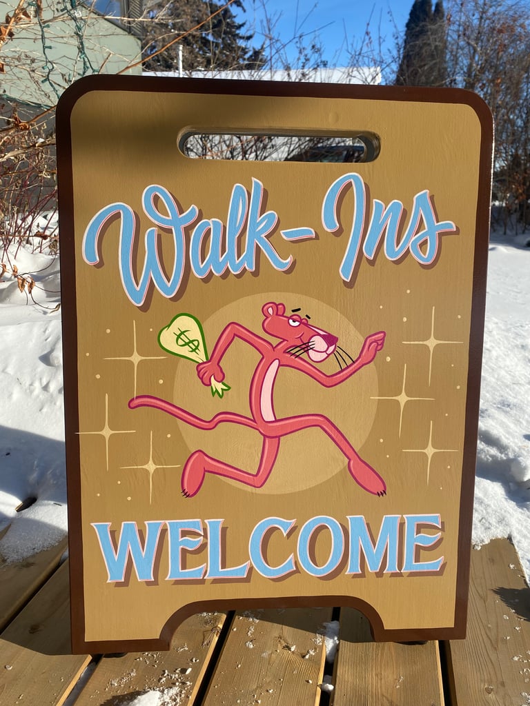 Walk in pink Panther A-frame sign. Painted on sealed MDO exterior grade material. Perfect for any business that accepts walk-ins.